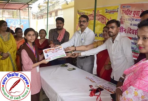 02 अक्टूबर 2024 : आज दिनांक 2 अक्टूबर दिन बुधवार को जनहित युवा वेलफेयर सोसाइटी के अध्यक्ष निखिल गुप्ता के नेतृत्व में मिर्जापुर स्थित कंपोजिट माध्यमिक विद्यालय में भारत के राष्ट्रपिता महात्मा गांधी व भारत के पूर्व प्रधानमंत्री लाल बहादुर शास्त्री जी के जयंती के अवसर पर निबंध प्रतियोगिता में छात्र छात्राओं के उत्कृष्ट प्रतिभा को देखते हुए टॉप 5 छात्र छात्राओं को सम्मानित किया गया । कार्यक्रम के मुख्य अतिथि नगर शिक्षा अधिकारी नरेंद्र सिंह रहे । सर्व प्रथम महात्मा गांधी जी व लाल बहादुर शास्त्री जी चित्र पर माल्यार्पण कर उनको नमन करते हुए श्रद्धा सुमन अर्पित कर भावपूर्ण श्रद्धांजलि अर्पित किया गया उसके उपरांत प्रथम पुरस्कार सूफिया इरशाद द्वितीय पुरस्कार कान्हा कुमार तृतीय पुरस्कार लक्की साहनी को नगर शिक्षा अधिकारी प्रधानाचार्य व सोसाइटी के अध्यक्ष निखिल गुप्ता के हाथो से छात्र छात्राओं को मेडल सम्मान पत्र से सम्मानित किया गया साथ ही साथ जिन छात्र छात्राओं ने प्रतियोगिता में भाग लिया था एक पत्र से सम्मानित किया गया साथ ही साथ जिन छात्र छात्राओं ने प्रतियोगिता में हिस्सा लिया था उनके भी मनोबल को बढ़ाने हेतु सम्मान पत्र देकर सम्मानित किया गया । बच्चो को संबोधित करते हुए नगर शिक्षा अधिकारी नरेंद्र सिंह ने कहा कि, सोसाइटी द्वारा इस तरह का कार्यक्रम काफ़ी सराहनीय है देश के स्वतंत्रता सेनानियों को हमें हमेशा उनके बलिदान को याद करते रहना चाहिए छात्र छात्राएं इसी तरह सभी प्रतियोगिताएं में प्रतिभाग करे जिससे आपकी प्रतिभा देखने को मिलेगी । संस्था अध्यक्ष निखिल गुप्ता ने सभी मेधावी छात्र-छात्राओं को शुभकामनाएं देते हुए कहा कि, आप इसी तरह से अपने प्रतिभा को दिखाकर अपने विद्यालय और अपने मां बाप का नाम रौशन करिए । सस्था अध्यक्ष निखिल गुप्ता न समा मेंधावा छात्र-छात्राসা को शुभकामनाएं देते हुए कहा कि, आप इसी तरह से अपने प्रतिभा को दिखाकर अपने विद्यालय और अपने मां बाप का नाम रौशन करिए । इस अवसर पर अध्यक्ष निखिल गुप्ता प्रधानाचार्य उम्में सादिया, नितीन श्रीवास्तव, शैलेश गुप्ता, अंबुज मिश्रा, हीना कौसर अंसारी, दीपांशु पाण्डेय, विजेंद्र मिश्रा, संजय कुमार सहित अध्यापक कर्मचारी गढ़ उपस्थित रहे ।