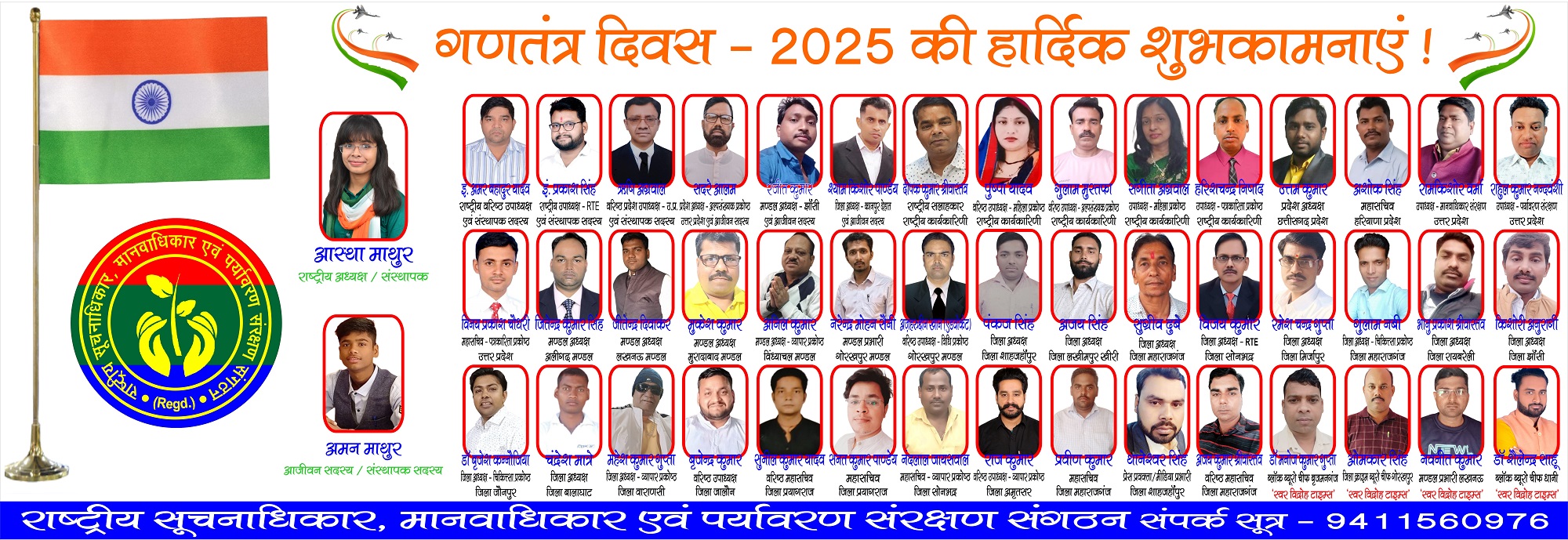 27 जनवरी 2025 : “राष्ट्रीय सूचनाधिकार, मानवाधिकार एवं पर्यावरण संरक्षण संगठन” के कार्यालय पर राष्ट्रीय पर्व – “गणतंत्र दिवस” के अवसर पर हर्षोल्लास के साथ ध्वजारोहण कर आमजन को मिठाई, समोसा, चाय एवं जल का वितरण किया गया ।