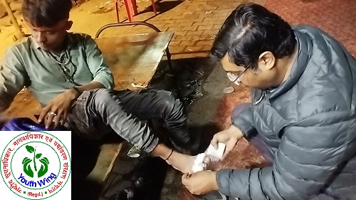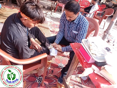 शनि मन्दिर, आगरा रोड, अलीगढ़ पर कावड़ियों की सेवार्थ आयोजित शिविर में कावड़ियों के पैर के घावों को साफ़ कर मरहम पट्टी, दवाई देने के साथ ही स्वास्थ परिक्षण किया गया ।