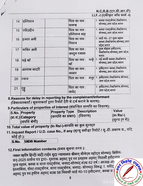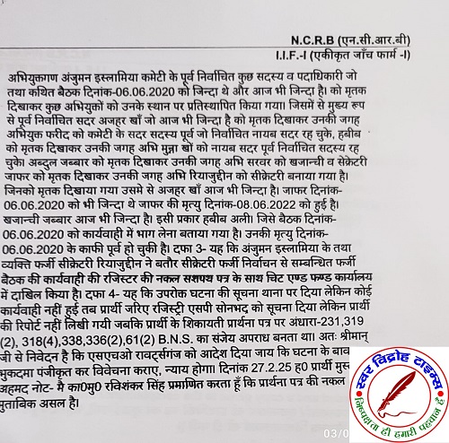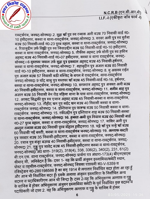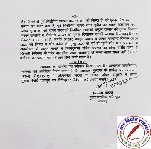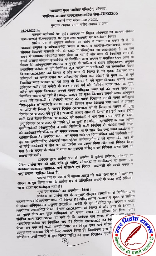03 मई 2025 : डिस्ट्रिक्ट बार एसोसिएशन सोनभद्र के अध्यक्ष जगजीवन सिंह एडवोकेट के मार्फत अपने वादकारी मुश्ताक अहमद पुत्र स्वर्गीय इसहाक अहमद निवासी हमीद नगर रॉबर्ट्सगंज सोनभद्र अध्यक्ष अंजुमन इस्लामिया कमेटी रॉबर्ट्सगंज सोनभद्र ने फरीद अहमद पुत्र स्वर्गीय हाफिज अहमद निवासी हमीद नगर रावटसगंज सोनभद्र सहित कुल 21 लोगों के खिलाफ अंतर्गत धारा 173 (3) बी एन एस एस थाना – रावटसगंज सोनभद्र के खिलाफ प्राथमिकी की दर्ज करने हेतु प्रार्थना पत्र दिया । विपक्षीगण फरीद अहमद व 21 अन्य की तरफ से अंजुमन इस्लामिया कमेटी के फर्जी सेक्रेटरी रियाजुद्दीन ने बतौर सेक्रेटरी फर्जी निर्वाचन से संबंधित फर्जी बैठक की कार्यवाही की रजिस्टर की नकल शपथ पत्र के साथ सोसाइटी चिट और फंड कार्यालय में दाखिल किया है तथा कई व्यक्तियों को मृतक दिखाकर फर्जी कार्यवाही की गई है इस पर विवेचना हेतु दिनांक 4 अप्रैल 25 को मुख्य न्यायाधीश दंडाधिकारी सोनभद्र के आदेश पर भारतीय दंड संहिता की धारा- 419, 420, 467, 469 व 471 में प्राथमिक की दर्ज दिनाक 2 मई 2025 को थाना रॉबर्ट्सगंज सोनभद्र में हो गई है ! जिस पर विवेचना जारी है तथा उपलब्ध साक्ष्य के आधार पर उपरोक्त मुकदमा अंजुमन इस्लामिया कमेटी के सदर के विरुद्ध फर्जी एवं मनगढ़ंत है ।