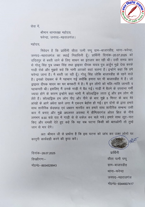 29 जुलाई 2025 : महाराजगंज जिले के ग्राम बाजार ढीह थाना फरेंदा के अंतर्गत एक मामला ऐसा सामने आया है जहां एक महिला को कार में बैठाया गया और फिर कोल्ड ड्रिंक में नशीला पदार्थ मिलाकर पिलाया गया । जब महिला को होश नहीं रहा तो उसके साथ बाजार डीह के रहने वाले गोलू सिंह सन ऑफ मुत्तुन सिंह, ग्राम बनकटी के दीपक सन ऑफ़ अर्जुन ने महिला के साथ कार में गैंगरेप किया और महिला का कहना है कि वह 20/07/2025 दिन रविवार 4:00 बजे ग्राम उदितपुर से कार में बैठाय और रात साढे नो बजे मुझे कैंपियरगंज ओवरब्रिज के नीचे कार से नीचे धकेल कर चले गए और करीब 1 घंटे बाद जब मुझे कुछ होश आया तो मुझे कुछ याद नहीं था कि मैं कहां हूं मैं किसी तरह उठ करके एक ठेले वाले से पूछी की भैया मैं कहां हूं तो उसने बताया कि मैं कैंपियरगंज में हूं उसके बाद मैं अपने घर अपने बच्चों के पास फोन की बच्चा आया और मुझे घर लेकर के गया । उसके दूसरे दिन मैं 1076 पर फोन करके अपनी बात को बताई तो वहां से बताया गया कि आप अपने संबंधित थाने में एक एप्लीकेशन दें उसके बाद कार्रवाई होगी । मेरे शरीर में काफी चोट आई थी मेरे साथ बहुत ही बड़ी घटना को अंजाम देते हुए यह दोनों व्यक्ति वहां से फरार हो गए और मुझे फोन पर धमकी देते हैं कि अगर इसकी सूचना तुम किसी को दी तो तुम्हें जान से मार दिया जाएगा ।