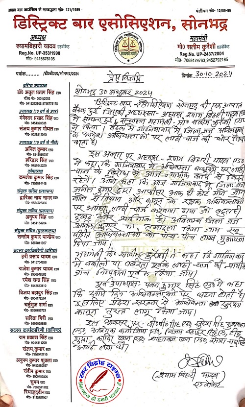 04 नवम्बर 2024 : डिस्ट्रिक्ट बार एसोसिएशन सोनभद्र की एक अपात बैठक हुई, जिसके अध्यक्षता अध्यक्ष श्याम बिहारी यादव एडवोकेट व संचालन महामंत्री मोहम्मद सलीम कुरैशी एडवोकेट ने किया ! बैठक में गाजियाबाद में जिला जज अनिल कुमार के आदेश पर अधिवक्ताओं लाठीचार्ज की घोर निंदा प्रस्ताव पास किया गया ! इस अवसर पर अध्यक्ष श्याम बिहारी यादव एड ने कहा कि गाजियाबाद में अधिवक्ता बंधुओं पर लाठी चार्ज के विरोध में आज न्यायिक कार्य से विरत रहेंगे, आगे कहा कि आज गाजियाबाद में जिला जज अनिल कुमार द्वारा ऑफिसर ऑफ द कोर्ट माने जाने वाले संविधान और कानून के रक्षक अधिवक्ताओं पर भयंकर लाठी चार्ज करवाया गया, जो बहुत ही दुखद और शर्मनाक है, अबिलंब गाजियाबाद जिला जज का तबादला किया जाए एवं पीड़ित अधिवक्ताओं को पांच-पांच लाख का मुआवजा दिया जाए । महामंत्री मोहम्मद सलीम कुरैशी एड ने कहा कि गाजियाबाद में वकीलों पर बर्बरता पूर्वक लाठी चार्ज की न्यायिक जांच निष्पक्षता पूर्वक किया जाए ! पूर्व उपाध्यक्ष पवन कुमार सिंह एडवोकेट ने कहा कि आए दिन अधिवक्ताओं पर घटना होती है इसलिए प्रदेश सरकार जल्द अधिवक्ता सुरक्षा कानून लागू करें ! इस अवसर पर बीपी सिंह (एडवोकेट), सुरेश सिंह कुशवाहा (एडवोकेट), राजेश यादव (एडवोकेट), महेंद्र कुशवाहा (एडवोकेट), अशोक कनौजिया (एडवोकेट), विजय बहादुर सिंह (एडवोकेट), टीटू गुप्ता (एडवोकेट), कादर खान (एडवोकेट), शाहनवाज खान (एडवोकेट), रमेश चंद सिंह, ललित सक्सेना (एडवोकेट) आदि लोग मौजूद रहे ।